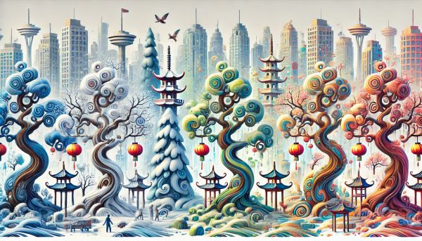 Laced with whimsy and bold abstraction, the canvas before us unifies the icy whispers of winter with the budding optimism of spring within the bustling environs of Chinatown, Vancouver. Vivid strokes create twisting arboreal forms, where roots seem to dance and branches swirl against a softened backdrop of city skyscrapers. Traditional elements like pagodas and red lanterns punctuate the scene, each detail an ode to the cultural richness that permeates the area. Delicate snowflakes float alongside blossoms in mid-air, symbolizing a seamless transition between the cold past and renewing future. This art not only captivates with its aesthetic delight but subtly narrates the continuous intertwining of nature with urban life, hinting at the timeless narratives held within cultural landscapes. Ethereal and serenely composed, it pulls viewers into a fantastical journey through time and imagination. *** About Vancouver's Chinatown: Founded in the late 19th century, Vancouver's Chinatown stands as one of the oldest and most historical in North America. It’s a vibrant hub known for its unique architecture, colorful festivals, diverse markets, and rich history. A walk through its streets offers a palpable sense of heritage, with traditional apothecaries, bustling tea shops, and family-run eateries. Beyond its cultural and culinary offerings, Chinatown plays a crucial role in the city’s arts scene, hosting numerous galleries and public art installations that highlight both local and international artists.