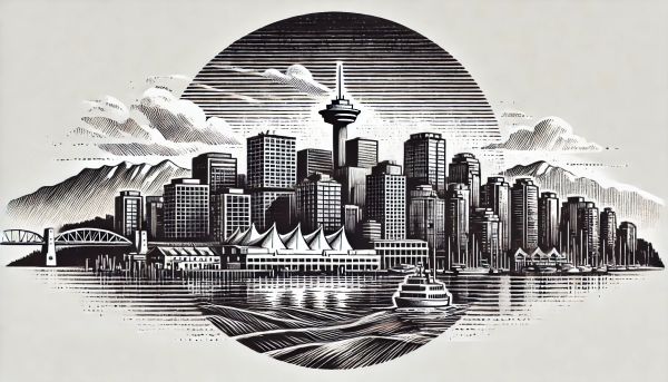 Artistically Rendered Vancouver Skyline in Monochrome Etching Style