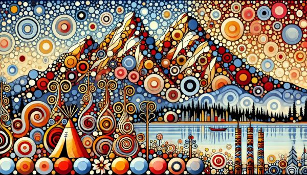 Explore a vivid and surreal landscape where inspiration flows as freely as the rivers depicted. In the foreground, a vibrantly colored teepee stands prominently, surrounded by swirling abstract patterns that evoke a sense of motion and vitality, further emphasizing the dynamic spirit of nature. The background features an artistically exaggerated interpretation of The Lions, iconic mountain peaks that are a celebrated part of Vancouver's skyline. These mountains are rendered with swirling circles and wavy lines, suggesting the rhythmic beauty of natural forms. Below the peaks, serene waters reflect the clear blue hues of a sky bursting with circular motifs that might represent the omnipresent raindrops of the Pacific Northwest. This energetic representation not only captivates viewers with its explosion of colors and forms but also plays a homage to the indigenous cultures and breathtaking natural scenes of Vancouver, fostering a deep appreciation for both cultural heritage and natural beauty.*** About The Lions: The Lions are two distinctive mountain peaks located north of Vancouver, British Columbia, and are visible from much of the Greater Vancouver area. Known as Ch'ich'iyúy ElxwÃkn to the Squamish people, these peaks hold significant spiritual importance and are a prominent feature in local indigenous lore. Standing at 1,646 meters and 1,606 meters, respectively, these twin summits offer breathtaking views and are popular destinations for hikers and outdoor enthusiasts seeking to experience the splendor of the Coast Mountains.