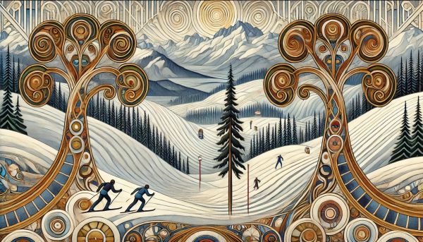 As morning frost glistens on the snow, skiers carve their paths through the pristine slopes of Vancouver's iconic mountain backdrop. Two expert skiers, depicted in harmonious motion, navigate the landscape that blends natural beauty with stunning, stylized artistry. The elaborate curves of aged trees, rich in golden and bronze tones, frame the snowy expanse, creating a visually arresting scene akin to a fantasy novel cover. This artwork is a unique representation of Vancouver's winter sports scene, capturing the essence of Grouse Mountain with a fantastical twist. Featured prominently in the background, the majestic peaks fade into softer shades of blue and white, hinting at the mountain's towering presence and its challenging terrains. This visual tribute to winter exploration is both a nod to the traditional and the imaginative realms of art and nature. *** About Grouse Mountain: Grouse Mountain, located just 15 minutes from downtown Vancouver, British Columbia, offers a variety of recreational activities throughout the year. In winter, it becomes a snow-covered haven for skiers and snowboarders, boasting 33 runs and an extensive network of chairlifts. The mountain's elevation and location provide ideal conditions for deep snowfalls, making it a popular destination not only for locals but also for tourists. In addition to winter sports, the area is known for its scenic cable car rides, hiking trails, and wildlife encounters. Grouse Mountain plays a significant role in Vancouver's cultural and recreational landscape, promoting outdoor activities and conservation.