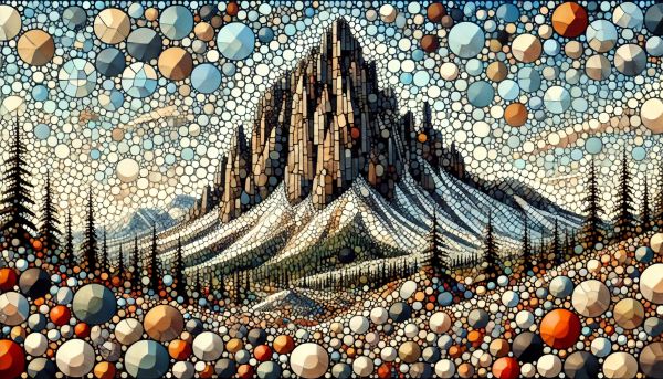 Immerse yourself in a vibrant kaleidoscope as Black Tusk stands majestically, its sharp, jagged contours soaring boldly towards the sky, captured through a cubist lens. This piece intricately arrays small, round, and curved shapes to mimic the rugged textures and sweeping gradients of a mountain landscape, transforming natural panorama into a symmetrical dance of color and form. The artwork melds cool and warm hues, suggesting the interplay between shadow and light that one experiences in the wild. Subtle gradients and the clever arrangement of shapes create an illusion of depth, making the volcanic peak appear simultaneously near yet distant. The canvas becomes a visual symphony where each segment contributes harmoniously to a comprehensive view, enticing observers to explore every detail of this geometric terrain. Through this artistic approach, the essence of British Columbia’s wilderness is preserved in an abstract, yet palpably majestic medium. *** About Black Tusk: Black Tusk is a striking volcanic spire located in the Garibaldi Provincial Park in British Columbia, Canada. Known for its unmistakable sharp, pinnacle shape, it is a remnant of an ancient stratovolcano formed over a million years ago. Standing at approximately 2,319 meters above sea level, it is a popular but challenging destination for hikers and climbers. The name 'Black Tusk' is derived from its dark, basaltic rock, which dominates the skyline and provides a stark contrast to the often snow-capped surroundings. This iconic landmark is not only a testament to Earth’s volcanic past but also a revered figure in local lore and a hotspot for outdoor enthusiasts seeking the thrill of adventure amidst breathtaking scenery.