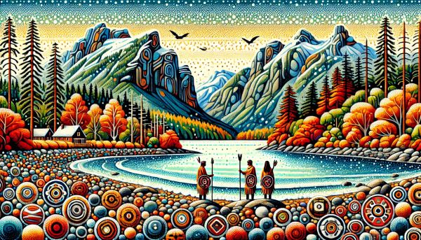Brushstrokes of vibrant oranges, fiery reds, and icy blues paint a breathtaking view of Howe Sound in this detailed artistic landscape. In the foreground, the lake shimmers calmly, reflecting the myriad of autumn colors and the early winter's pristine whiteness, while whimsically patterned stones populate its banks, hinting at the rich cultural tapestry of the region. Enthralled by the scenic beauty, three figures adorned in traditional garb celebrate this harmonious blend of nature and culture. Beyond them, snow begins to cap the soaring mountains, providing a sharp contrast to the warm tones of the deciduous trees readying for winter's chill. This scene masterfully captures the seasonal transition enveloping the area, offering viewers not merely a visual feast but an invitation to experience the serene and rhythmic pulse of Howe Sound. *** About Howe Sound: *** Howe Sound is a majestic fjord located in British Columbia, just northwest of Vancouver. Known for its dramatic landscape encompassing steep, snow-capped mountains and deep blue waters, the sound is a popular destination for tourists seeking adventure and natural beauty. Maritime activities such as sailing, diving, and wildlife viewing are prolific, especially given the region's recovery of marine biodiversity in recent years. The area is also significant for its cultural heritage, with indigenous Squamish Nation history deeply woven into the fabric of the land.