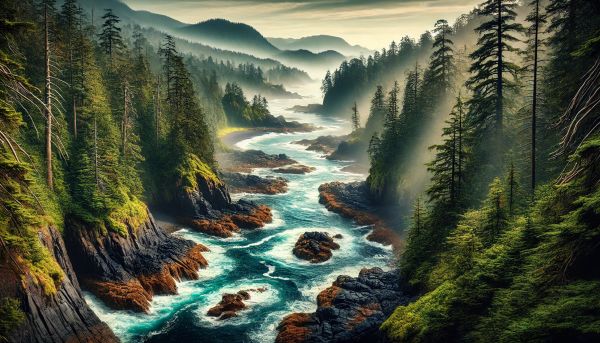 Bathed in the soft glow of morning light, the rugged coastlines of Pacific Rim National Park Reserve unveil a symphony of natural wonder. Meandering through the dense, mist-covered forests, the river carves a pathway of turquoise through dark, jagged cliffs and soothing greens of ancient trees. The air is filled with the crisp scent of pine and the distant roar of the Pacific Ocean, creating a tranquil yet dramatic atmosphere that beckons nature lovers and photographers alike. From the vantage point captured in the image, one experiences a seamless blend of dynamic waters and static mountains, offering a moment of true awe and serenity. *** About Pacific Rim National Park Reserve: Nestled on Vancouver Island's western shore, Pacific Rim National Park Reserve is a prized area within British Columbia, Canada, known for its rich biodiversity and stunning landscapes. This park stretches over 511 km², featuring lush temperate rainforests, dynamic marine systems, and rugged coasts lined with rocky shores and sandy beaches. It attracts adventurers, conservationists, and researchers who explore its ecosystems, which are home to a variety of plant species and wildlife including black bears, wolves, and countless bird species. The park is also culturally significant, with historical ties to several Indigenous groups who have inhabited the land for thousands of years, offering a wealth of knowledge and history that adds to the depth of visitors' experiences.