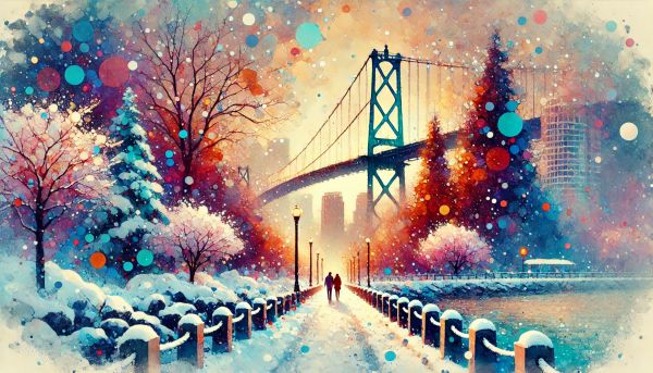 Bathed in the glow of a wintry sunset, the iconic Lions Gate Bridge spans the frosty scene, framed by snow-kissed trees under a vivid, speckled sky. This artistic interpretation transforms the everyday into an otherworldly experience, with hues of blues, purples, and fiery oranges blending into a dreamy mosaic that dances across the canvas. A pair of silhouetted figures ventures along the snow-lined path, adding a sense of scale and life to the composition. The whimsical splashes of color and light give the landscape a touch of magic, inviting viewers to pause and immerse themselves in this surreal winter wonderland. *** About Lions Gate Bridge: The Lions Gate Bridge is a suspension bridge that crosses the Burrard Inlet, connecting the City of Vancouver to the North Shore municipalities of British Columbia, including North Vancouver and West Vancouver. Completed in 1938, it is named for the Lions, a pair of mountain peaks north of Vancouver. The bridge is a significant landmark in Vancouver, known for its striking design and historical value. As a vital connection within the regional road network, it not only serves as a critical transport link but also offers spectacular views of the harbor and surrounding areas, making it a favored subject for photography and a beloved sightseeing spot for visitors and locals alike.