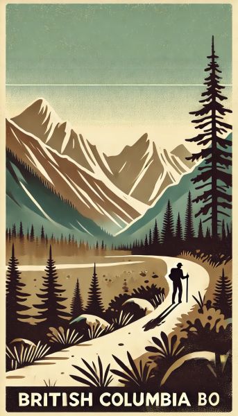 Stepping into a frame from the past, the depicted retro-inspired poster enchants with a serene portrayal of British Columbia's rugged beauty. It illustrates a peaceful landscape where towering mountain peaks meet the rich evergreen forests along a winding hiking trail. Warm hues of brown and green dominate the scene, casting a nostalgic glow reminiscent of old travel brochures. At the heart of this picturesque setting, a solitary hiker is captured in silhouette against the vivid backdrop of nature’s splendor. This art beautifully honors the tranquil solitude and untouched wilderness of Canada’s Pacific Coast. As a decorative piece, it invites viewers to dream of alpine adventures and quiet moments beside remote mountain lakes. It brilliantly merges historical art influences with contemporary design sensibilities to appeal to both outdoor enthusiasts and art collectors. Transporting observers to a simpler time, this Vancouver CityScape Poster promotes a connection with the great outdoors, encouraging a wanderlust for exploring the natural world. *** About British Columbia: As Canada's westernmost province, British Columbia is celebrated for its remarkable diversity in landscapes ranging from lush rainforests to rugged mountain ranges. The depicted scene may represent iconic spots like the Coast Mountains or the famous trails of the Rocky Mountains, known for their breathtaking vistas and abundant wildlife. British Columbia attracts millions of visitors annually, drawn to its expansive terrains ideal for hiking, skiing, and mountain biking, and is also a vital locale for ecological studies and conservation efforts.